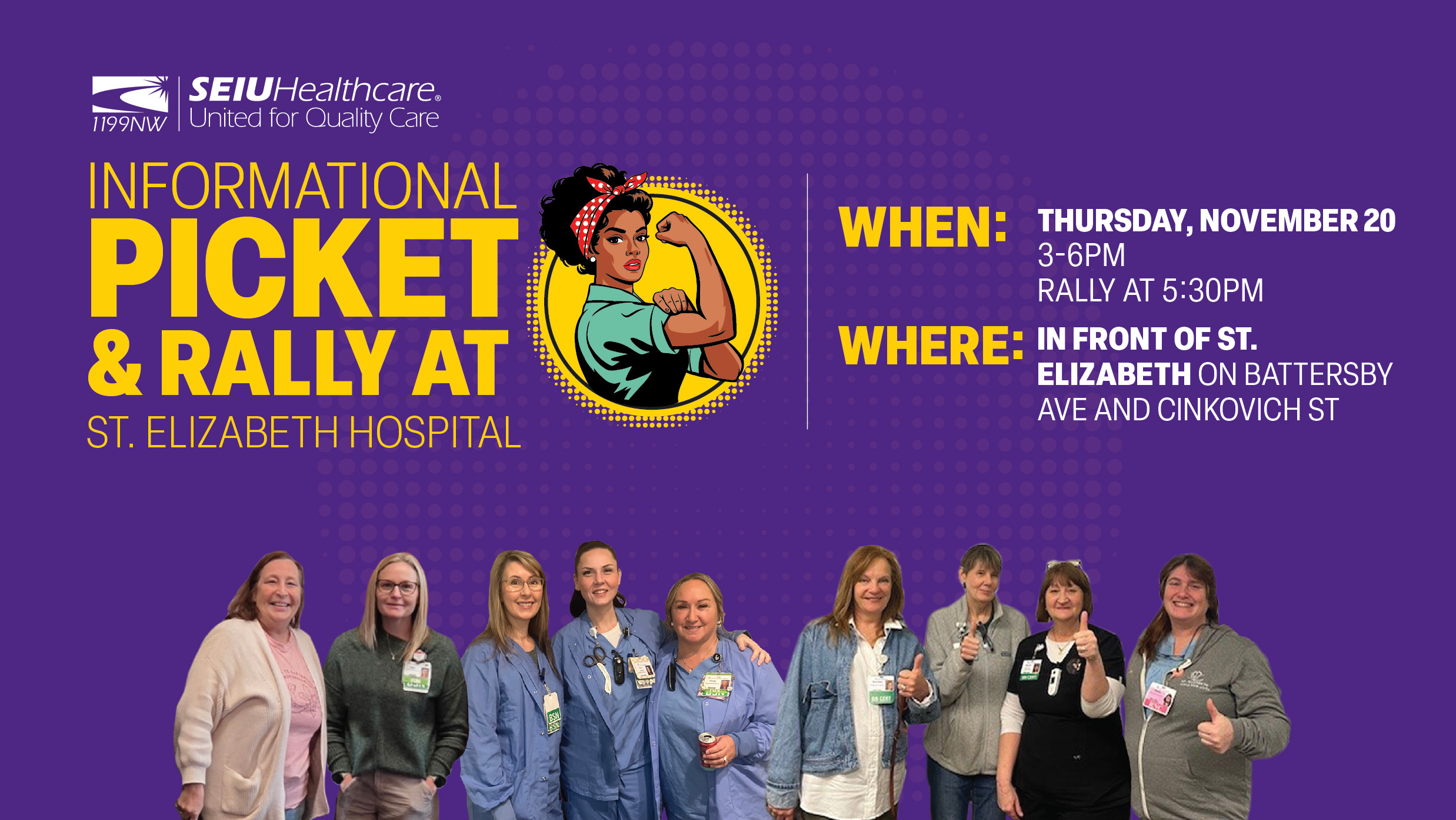 Nurses at St. Elizabeth Hospital in Enumclaw are holding an informational picket on Thursday, November 20. After 7 months, administration is not bringing proposals that will recruit and retain the quality caregivers we need at our critical access hospital. Instead of investing in rural nurses and our critical access hospital, corporate parent CommonSpirit continues to bring unacceptable proposals after 7 months of bargaining for our new union contract. Stand with us on the picket line as we fight for recruitment and retention, staffing, education, and more.